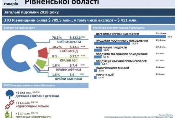 Експорт товарів з Рівненщини минулого року зріс майже на 7,2% і досяг 411 млн. дол. США. При цьому торгівля між нашою областю та іншими країнами пожвавилася та склала близько 710 млн. дол. США.