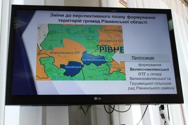 Так, до Рівненської ОДА звернулися представники Великоомелянської та Грушвицької сільських рад Рівненського району. Люди просять внести зміни до перспективного плану. Згідно документу ці дві сільські ради входять до Дядьковицької ОТГ, яка утворилася минулоріч, але без цих територій. Тепер, після численних обговорень, вивчення думок, люди просять утворити одну громаду у форматі двох сільських рад.