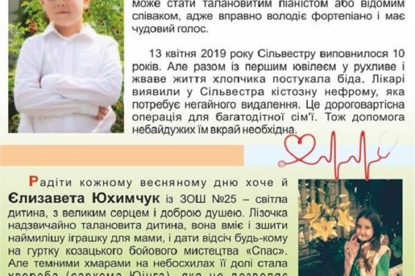 Збиратимуть кошти на лікування й для Єлизавети Юхимчук із ЗОШ №25. Дівчинка любить вишивати, а також ходить на гурток козацького бойового мистецтва “Спас”. У Єлизавети виявили хворобу саркома Юнга.