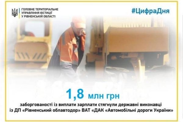Відділом примусового виконання рішень управління державної виконавчої служби Головного територіального управління юстиції у Рівненській області з ДП «Рівненський облавтодор» ВАТ «ДАК «Автомобільні дороги» стягнуто заборгованість із зарплати у розмірі 1 812 661 грн. Кошти виплачені по 302 виконавчим провадженням.