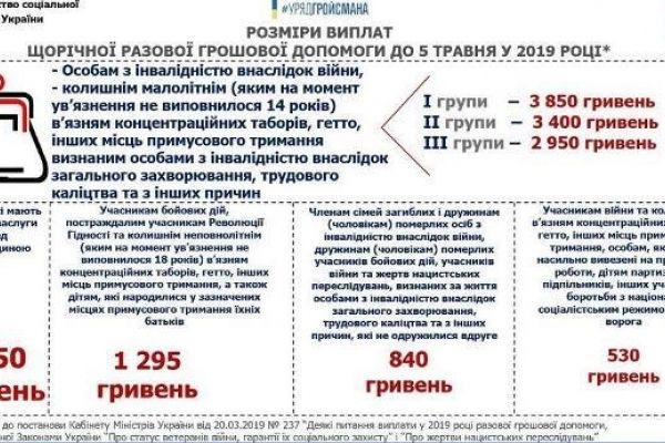 Разову грошову допомогу, передбачену Законами України «Про статус ветеранів війни, гарантії їх соціального захисту» і «Про жертви нацистських переслідувань», виплатять до 9 травня.