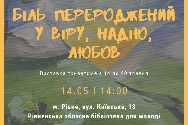 Відкриття виставки робіт «Біль, перероджений у віру, надію, любов…» відбудеться у вівторок, 14 травня о 14.00 в Рівненській обласній бібліотеці для молоді (вул. Київська,18).
