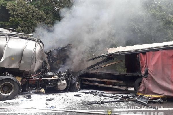 Унаслідок лобового зіткнення автомобілів «Renault» і «DAF» сталося загоряння транспортних засобів. Працівники ГУ ДСНС ліквідували пожежу. Попередньо у ДТП травмувався водій автомобіля «DAF».
