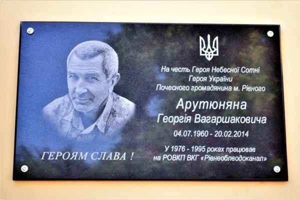 Пам’ятний знак Георгію Арутюняну встановили на фасаді «Рівнеоблводоканалу». Саме тут загиблий пропрацював 19 років поспіль. У 2014 році Георгій Арутюнян став учасником Євромайдану.