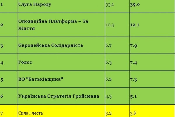Якби вибори до Верховної Ради України відбулися найближчої неділі, то з тих українців, хто планує голосувати і вже визначився зі своїм вибором, за партію “Слуга народу” віддали б свої голоси 39,0%, партію “ОПОЗИЦІЙНА ПЛАТФОРМА – ЗА ЖИТТЯ” – 12,1%, партію “Європейська Солідарність” – 7,9%, партію “Голос” – 7,4%, ВО “Батьківщина’ – 7,3%, партію “Українська Стратегія Гройсмана” – 5,1%.