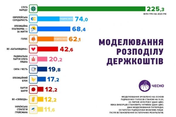 Сума державного фінансування партій залежить від розміру прожиткового мінімуму та явки на виборах. Згідно з даними ЦВК, явка на цих виборах становила 14,7 мільйона виборців. Кожен виборець приносить до загального кошика державного фінансування 2% прожиткового мінімуму, або 38 гривень і 42 копійки. Фактично ви фінансуєте не всі партії загалом, а конкретно ту, за яку проголосували. Саме від кількості голосів за конкретну партію залежить, скільки держкоштів вона одержить. Таким чином загальний бюджет держфінансування партій у 2020 році сягатиме 565,5 мільйона гривень.