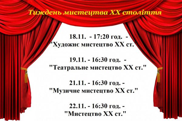 Тематичний тиждень «Мистецтво ХХ століття» В ОШМ стартує у понеділок, 18 листопада. Упродовж п’яти днів острожани зможуть відвідати різні заходи – виставки, концерти, вистави, тощо. Усі заходи відбуватимуться в актовій залі школи.