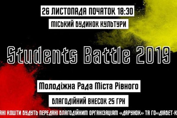 У “Students Battle 2019″ візьмуть участь такі освітні заклади: Рівненський державний гуманітарний університет, Національний університет водного господарства та природокористування, Міжнародний економіко-гуманітарний університет, Рівненська медична академія, Рівненський кооперативний економіко-правовий коледж, Технічний коледж НУВГП, Відкритий міжнародний університет розвитку людини “Україна”, Рівненський економіко-технологічний коледж, Рівненський автотранспортний коледж НУВГП, Рівненське професійне технічне училище ресторанного сервісу та торгівлі. У програмі заходу концертні виступи (танцювальні, вокальні номери, гумор-шоу), а також командні змагання.