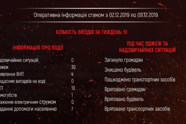 За минулий тиждень з 02.12.2019 до 09.12.2019 року пожежно-рятувальними підрозділами ДСНС Рівненщини було ліквідовано 30 пожеж та 7 разів надано допомогу населенню під час різних надзвичайних подій.