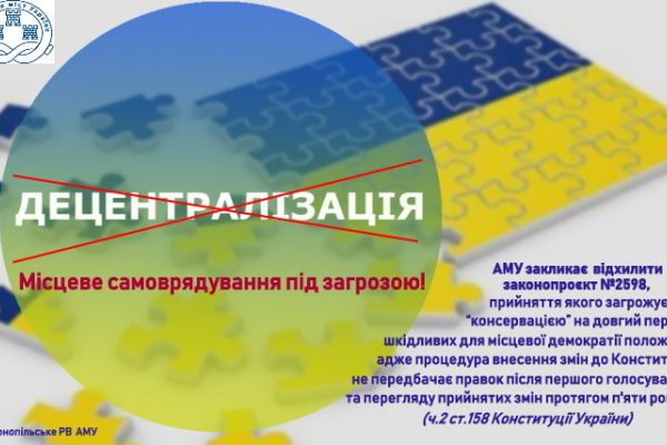 Асоціація міст України звернулася до Голови Верховної Ради України Дмитра Разумкова, голів депутатських фракцій та груп, парламентських Комітетів з питань організації державної влади, місцевого самоврядування, регіонального розвитку та містобудування, з питань правової політики, з питань антикорупційної політики, з питань інтеграції України з Європейським Союзом, з питань бюджету з листом, у якому заявила, що не підтримує проєкт Закону України «Про внесення змін до Конституції України (щодо децентралізації влади)» №2598 від 27 грудня 2019 року.