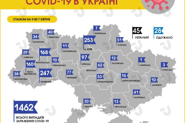 В Україні станом на ранок вівторка, 7 квітня, зареєстровано 1462 випадки зараження коронавірусом, 45 осіб померли.