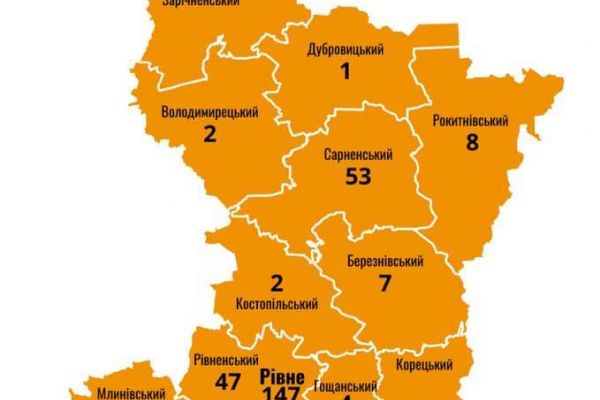 Розподіл діагностованих випадків COVID-19 такий: м.Рівне – 147; Сарненський район – 53; Рівненський район – 47; Здолбунівський район – 24; Дубенський район – 11; Радивилівський район – 11; Березнівський район – 7; Гощанський район -4; Володимирецький район – 2, Рокитнівський – 8, Костопільський – 2, Млинівський – 1, Острозький – 1, Дубровицький – 1.