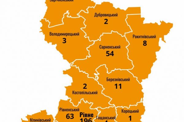 Розподіл діагностованих випадків COVID-19 такий: м.Рівне – 196; Сарненський район – 54; Рівненський район – 63; Здолбунівський район – 30; Дубенський район – 11; Радивилівський район – 13; Березнівський район – 11; Гощанський район -4; Володимирецький район – 3, Рокитнівський – 8, Костопільський – 2, Млинівський – 3, Острозький – 1, Дубровицький – 2, Корецький – 1.