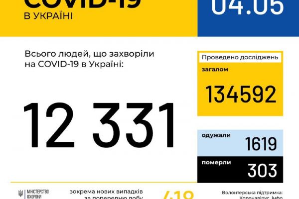 За даними Центру громадського здоров’я, станом на 9:00 4 травня в Україні 12331 лабораторно підтверджений випадок COVID-19, з них 303 летальні, 1619 пацієнтів одужало. Хворобу підтверджено у 855 дітей та 2 387 медиків.
