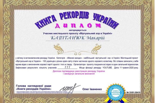 У рамках мистецького проєкту «Віртуальний хор України» Макарій отримав диплом від Голови наглядової ради “Книги рекордів України” Олега Іваненко та потрапив до « Книги рекордів України».