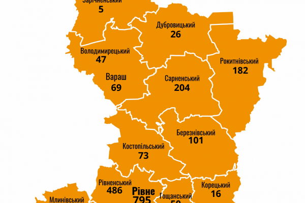 Розподіл діагностованих випадків COVID-19 такий: м. Рівне – 795; Сарненський район – 202; Рівненський район – 486; Здолбунівський район – 164; Дубенський район – 74; Радивилівський район – 44; Березнівський район – 101; Гощанський район – 50; Володимирецький район – 42; м. Вараш – 69; Рокитнівський – 182; Костопільський – 73; Млинівський – 7; Острозький – 49; Дубровицький – 26; Корецький – 16; Демидівський – 1, Зарічненський – 5.