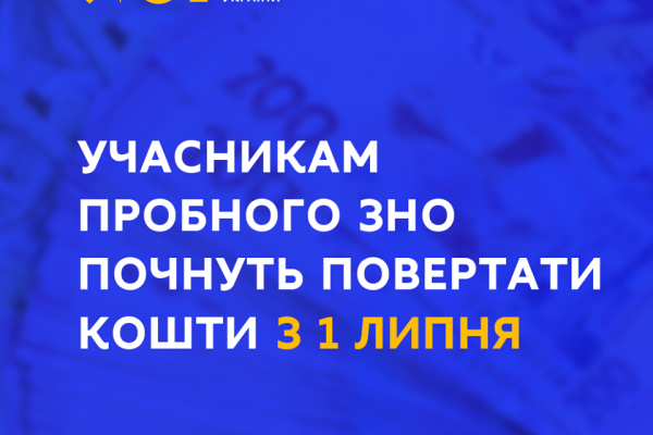 «Виплати коштів учасникам пробного ЗНО розпочнуться вже за два тижні – 1 липня – і будуть здійснюватись через відділення ПриватБанку. Учасники пробного ЗНО, які мають картку ПриватБанку, отримають SMS-повідомлення від банку про зарахування коштів. Якщо учасник не має картки, він отримає SMS-повідомлення про те, що картка з компенсованими грошима чекає у найближчому відділенні банку», – зазначила т.в.о. Міністра освіти і науки Любомира Мандзій.