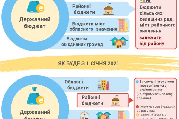 Виходячи із законопроекту, доходи і видатки між бюджетами районів та територіальних громад розмежують. Районні бюджети пропонується виключити із системи горизонтального вирівнювання. Тобто районні бюджети не отримуватимуть базову дотацію і не будуть на прямих міжбюджетних відносинах з державним бюджетом.