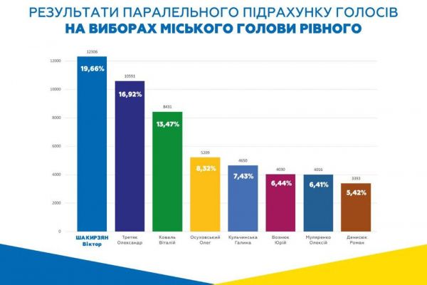 Таким чином, у першому турі виборів міського голови переміг Віктор Шакирзян, лідер політичної партії “Рівне Разом”, разом з ним у другий тур виходить Олександр Третяк, представник “Європейської солідарності”.
