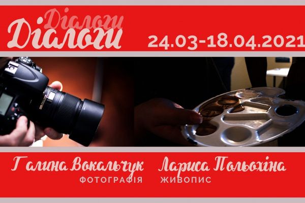 Це «ДІАЛОГИ» двох мисткинь – живописні думки Лариси Польохіної і фоторефлексії її колеги Галини Вокальчук. Жінки прагнуть вивести глядача на діалог про сприйняття сьогоднішнього світу, адже їхні роботи про уявлення людей про форму і красу та про перетин цих уявлень у мистецтві. Варто згадати, що своєю дружбою вони завдячують Анатолієві Іваненку, саме на його заняттях арт-студії у стінах «Євро-Арту» вони отримали поштовх до спільного колористичного голосу про радість буття.