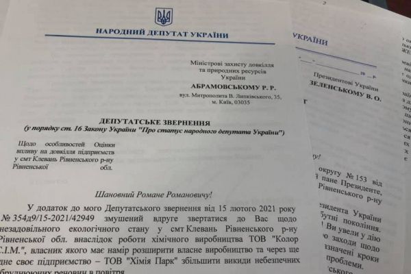 Підготував звернення і на Держспоживслужбу України, яка під час ухвалення рішення має взяти до уваги результати замірів викидів забруднюючих хімічних речовин, перевищення норм яких неодноразово фіксувалися Рівненським лабораторним центром, численні скарги жителів на погіршення стану здоров‘я та інформацію місцевої лікарні про збільшення рівня захворюваності на обструктивне захворювання легенів з початку роботи «КОЛОР С.І.М.» у 29 разів!!!