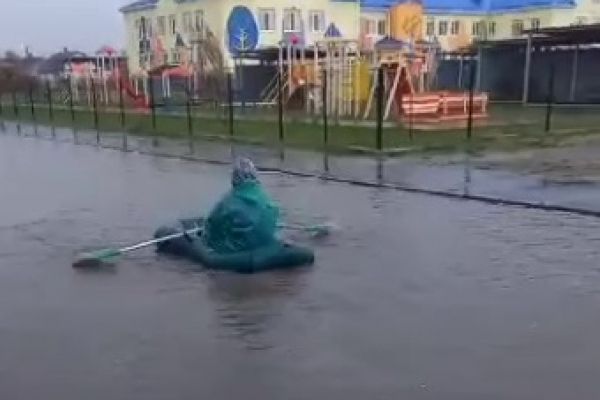 На відео видно, що неподалік дитячого майданчика рівень води на дорозі був таким, що дозволив чоловікові з веслами плавати на надувному човні.
