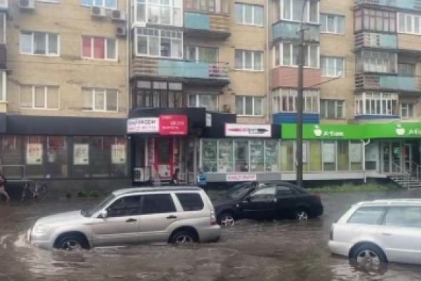 У Рівному перші літні зливи традиційно затопили вулиці у центрі міста. Водії опинилися у водяній пастці.