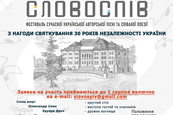 14-15 серпня 2021 року до 30 років Незалежності України вперше у Рівному відбудеться Фестиваль сучасної української авторської пісні та співаної поезії «СЛОВОСПІВ».