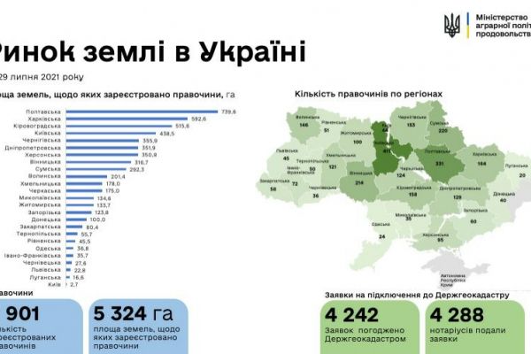 З початку липня у Рівненській області зареєстрована 51 земельна угода на загальну площу 45,5 га. А загалом з початку старту ринку землі в Україні зареєстровано 2 901 земельна угода купівлі-продажу.