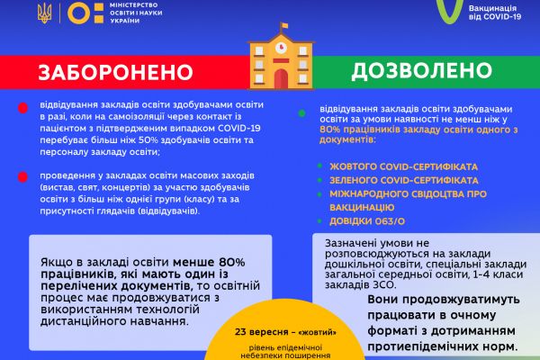 «При “жовтому” рівні відвідування закладів освіти здобувачами освіти буде дозволено за умови наявності не менш ніж у 80% працівників закладу освіти одного з обов’язкових документів. Їх перелік опублікований тут. Якщо в закладі освіти менш ніж 80% працівників, які мають один із необхідних документів, навчання має продовжуватися (!) з використанням технологій дистанційного навчання. Підкреслюю, освітній процес триватиме в дистанційному форматі», – наголосив Міністр.