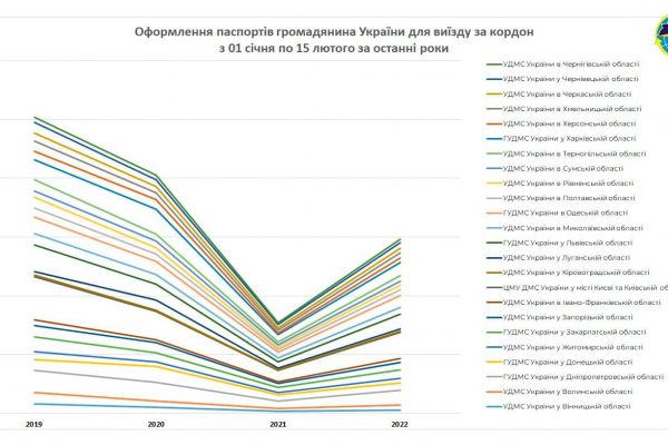 У ДМС України проаналізовано ситуацію щодо кількості оформлених закордонних паспортів у період з 1 січня по 15 лютого 2022 року, а також аналогічні періоди 2019, 2020 та 2021 років.