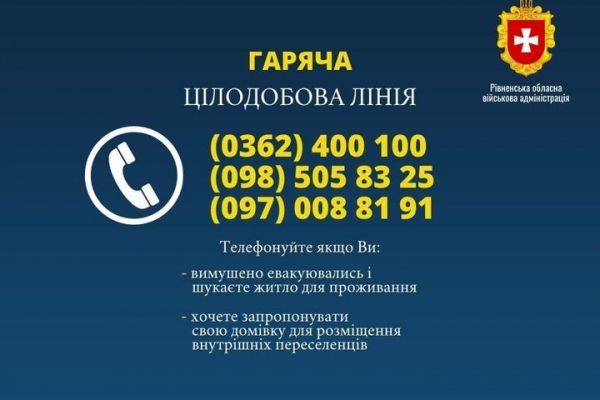 Нагадуємо, для вимушено евакуйованих діє цілодобова гаряча лінія ГУ Національної соціальної сервісної служби у Рівненській області: (0362) 400 100, 098-505-83-25, 097-008-81-91. Сюди також можуть звертатися місцеві жителі, які хочуть запропонувати житло.