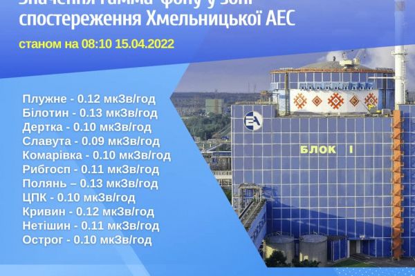 15 квітня 2022 року радіаційний фон на промисловому майданчику Хмельницької атомної електростанції та у Зоні спостереження не перевищує допустимих норм. Показники знаходяться на рівні, який відповідає нормальній експлуатації енергоблоків та не перевищують природних фонових значень*.