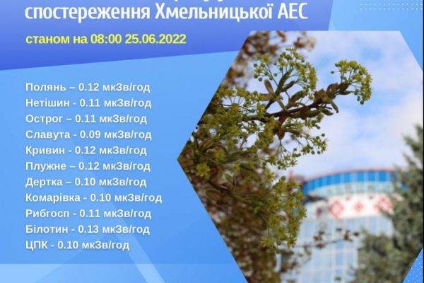 25 червня 2022 року радіаційний фон на промисловому майданчику Хмельницької атомної електростанції та у Зоні спостереження не перевищує допустимих норм. Показники знаходяться на рівні, який відповідає нормальній експлуатації енергоблоків та не перевищують природних фонових значень*.