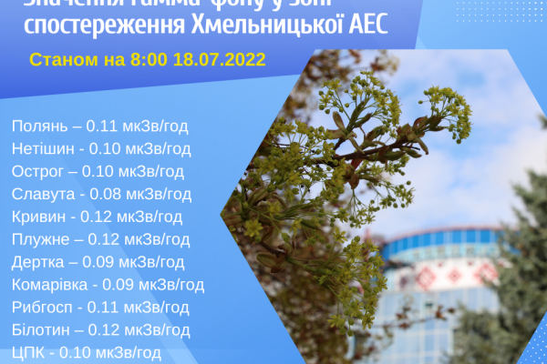 18 липня 2022 року радіаційний фон на промисловому майданчику Хмельницької атомної електростанції та у Зоні спостереження не перевищує допустимих норм. Показники знаходяться на рівні, який відповідає нормальній експлуатації енергоблоків та не перевищують природних фонових значень*.