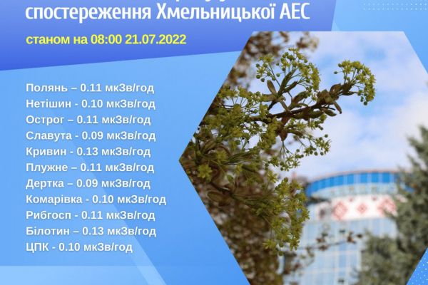 21 липня 2022 року радіаційний фон на промисловому майданчику Хмельницької атомної електростанції та у Зоні спостереження не перевищує допустимих норм. Показники знаходяться на рівні, який відповідає нормальній експлуатації енергоблоків та не перевищують природних фонових значень*.