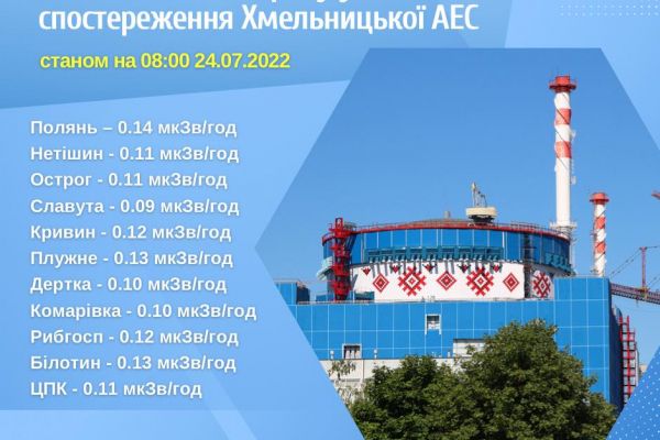24 липня 2022 року радіаційний фон на промисловому майданчику Хмельницької атомної електростанції та у Зоні спостереження не перевищує допустимих норм. Показники знаходяться на рівні, який відповідає нормальній експлуатації енергоблоків та не перевищують природних фонових значень*.