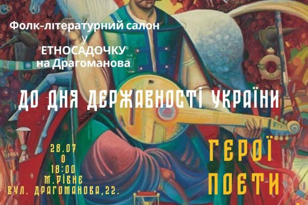 До Дня Української державності з ініціативи Рівненської організації Національної спілки письменників України та КЗ “Рівненський обласний центр народної творчості” РОР за підтримки Управління культури та туризму Рівненської ОДА, 28 липня о 18 год за адресою м. Рівне, вул. Драгоманова, 22 в “Етносадочку”, на території Рівненського обласного центру народної творчості, відбудеться благодійний захід для збору коштів на ЗСУ, який згуртує письменників, митців, інтелігенцію, українську громадськість – фолк-літературний салон просто неба: “Герої, поети і кобзарі”!