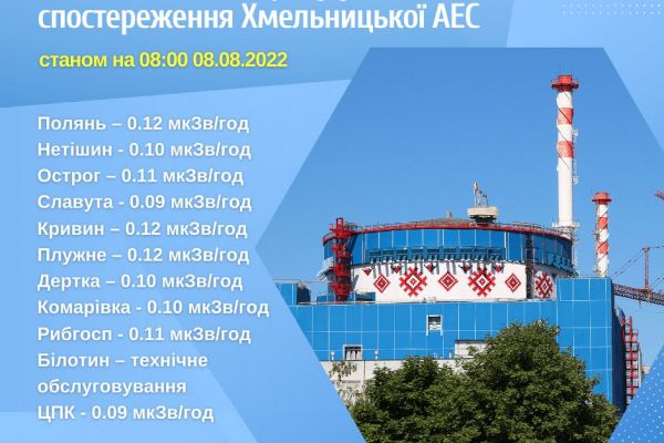 08 серпня 2022 року радіаційний фон на промисловому майданчику Хмельницької атомної електростанції та у Зоні спостереження не перевищує допустимих норм. Показники знаходяться на рівні, який відповідає нормальній експлуатації енергоблоків та не перевищують природних фонових значень*.
