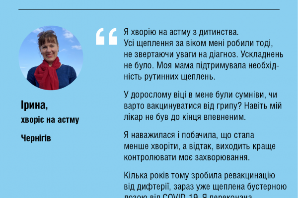 Про українців, які мають хронічні хвороби та які обрали вакцинацію, щоб захиститися від небезпечних інфекції та їхніх наслідків, читайте в історіях.
