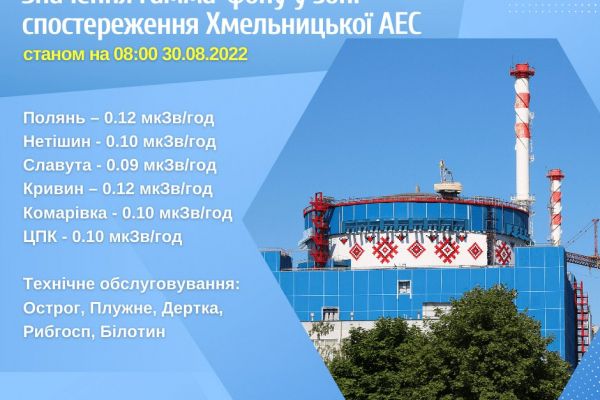 30 серпня 2022 року радіаційний фон на промисловому майданчику Хмельницької атомної електростанції та у Зоні спостереження не перевищує допустимих норм. Показники знаходяться на рівні, який відповідає нормальній експлуатації енергоблоків та не перевищують природних фонових значень*.