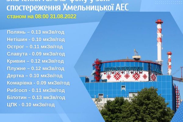 31 серпня 2022 року радіаційний фон на промисловому майданчику Хмельницької атомної електростанції та у Зоні спостереження не перевищує допустимих норм. Показники знаходяться на рівні, який відповідає нормальній експлуатації енергоблоків та не перевищують природних фонових значень*.