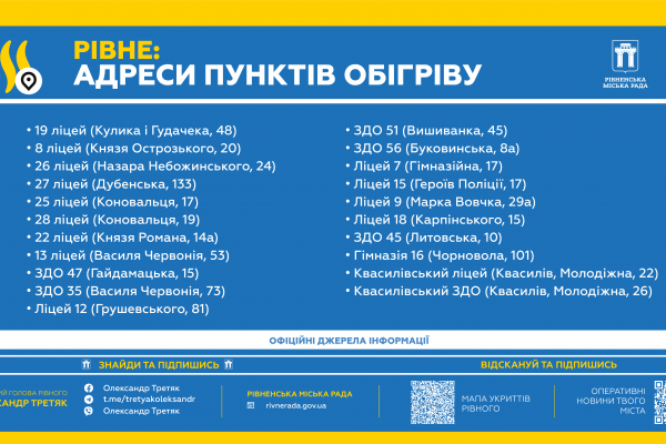 Адреси пуктів обігріву в Рівному: всі вони працюють цілодобово