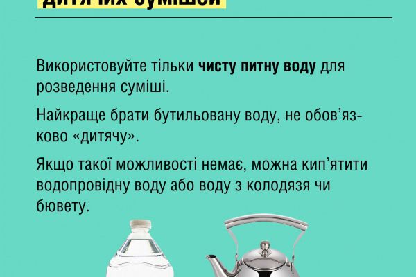 Якщо ваша дитина на штучному або змішаному вигодовуванні, то використовуйте тільки чисту питну воду для розведення суміші.