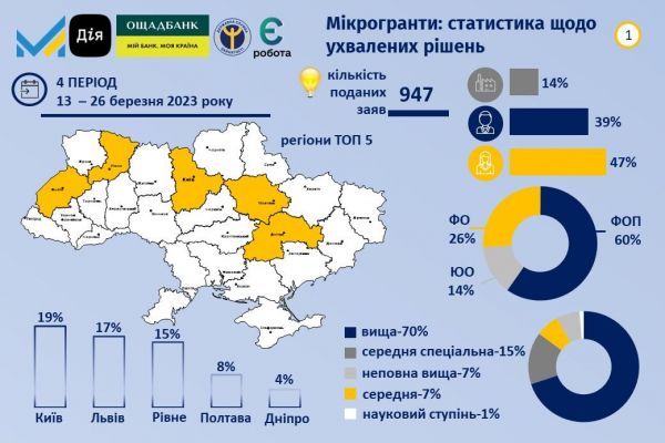 Також додав, що найпопулярнішими сферами, в яких працюють грантоотримувачі, є: оптова та роздрібна торгівля; ремонт автотранспортних засобів; тимчасове розміщування й організація харчування; переробна промисловість.
