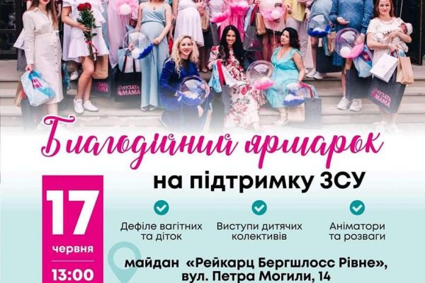 17 червня на майдані «Рейкарц Бергшлосс Рівне» за адресою: м.Рівне, вул. Петра Могили, 14 о 12 годині розпочне свою роботу благодійного ярмарок. Офіційна частина о 13 годині.