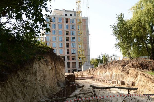 Тут забудовник розпочав спорудження дороги. Як результат – можемо побачити будівельний котлован на території, де раніше знаходились зелені насадження.