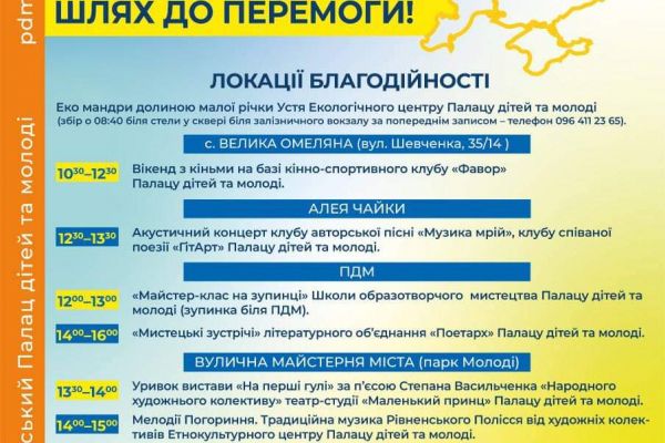Локації благодійності: ПДМ, Алея Чайки, Вулична майстерня міста, парк Молоді, парк імені Т. Шевченка. У програмі заходу – музичні імпрези, майстер-класи, інтелектуальний пікнік та інші активності.