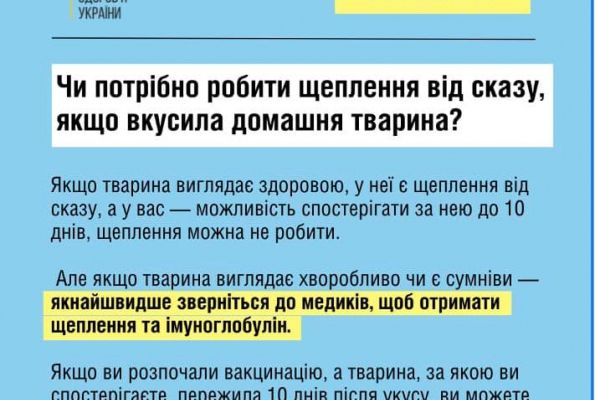 Нагадаємо, сказ – вірусне захворювання. Воно має найвищий рівень смертності серед усіх інфекційних хвороб людини. Після появи симптомів сказ стає невиліковним – 100% хворих помирають, тож дуже важливо звертатися по допомогу вчасно.