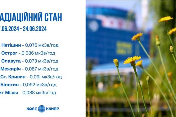 Радіаційний стан навколо Хмельницької АЕС у період з 17 по 24 червня 2024 року на промисловому майданчику та у прилеглих регіонах знаходився на рівні, відповідному нормальній експлуатації енергоблоків, і не перевищував природних фонових значень.